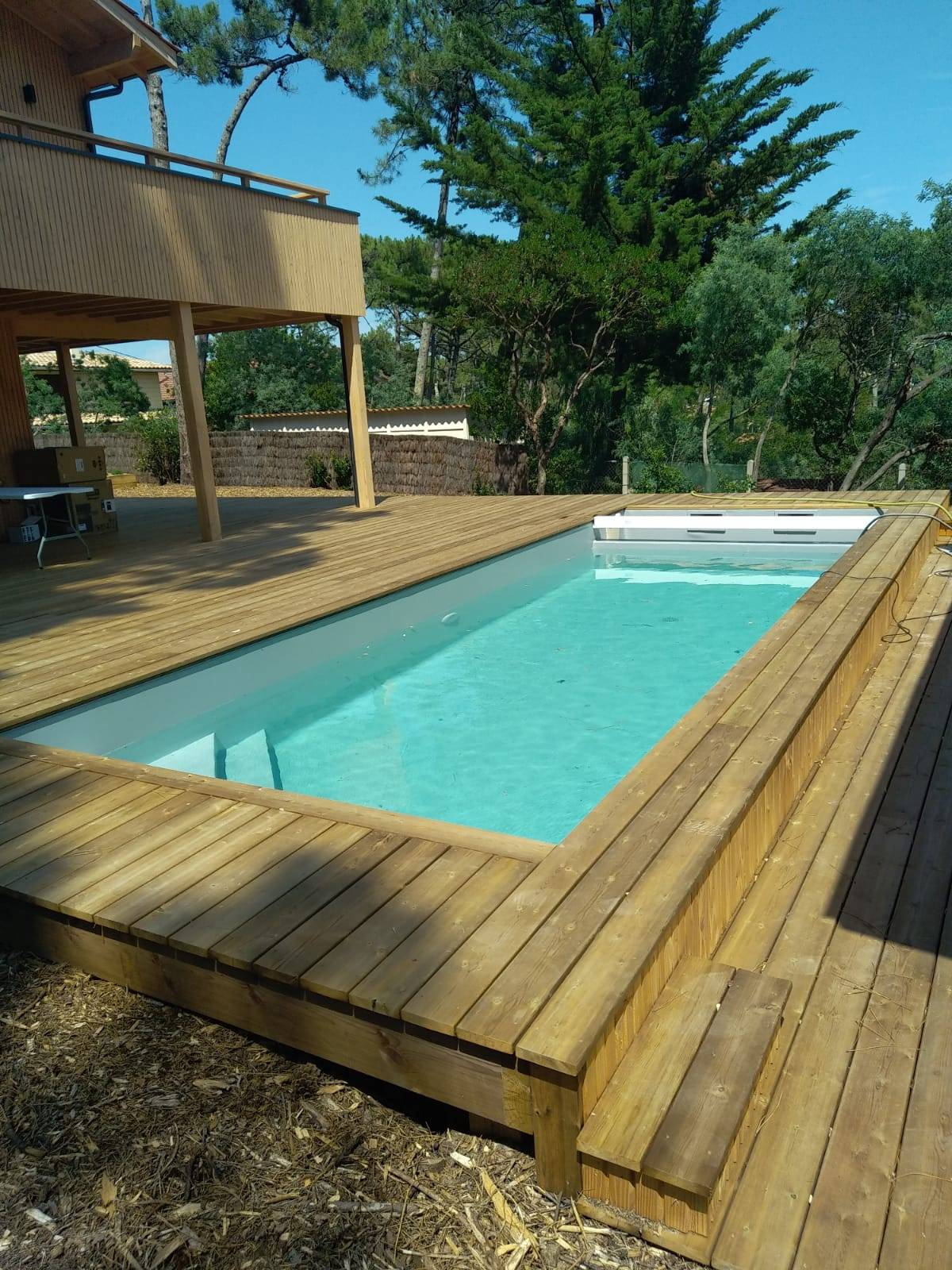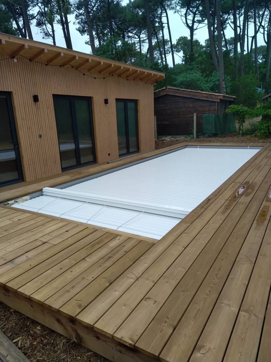 Nos clients ont choisi un volet immergé avec caillebotis bois. Ce volet immergé s’intègre parfaitement au bassin, vous souhaitez des informations sur ce modèle de volet ! il faut s'adresser à DE MELO PISCINES à Saint Jean d'Illac !
