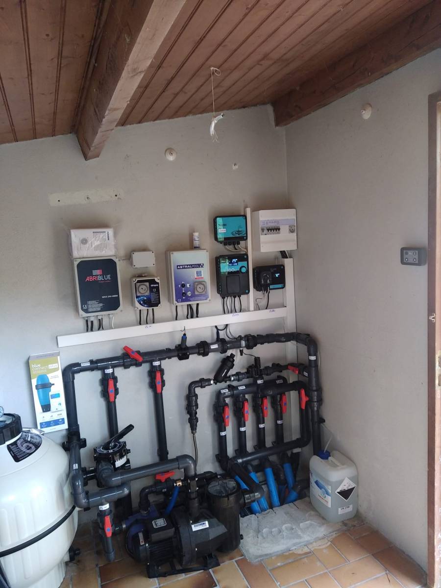 La filtration du bassin se compose d'un filtre à sable 15 m3/h et d'une pompe 1 cv, d'un appareil de traitement au sel de marque Régul'Electronique, composée de l'appareil au sel et de sa cellule.
