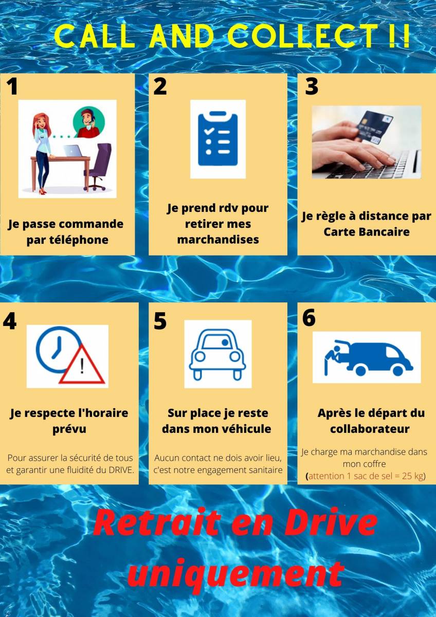 Nous vous rappelons la procédure "CALL ET COLLECT" (cliquez sur la photo) et vous remercions de l'appliquer rigoureusement pour la sécurité de tous.