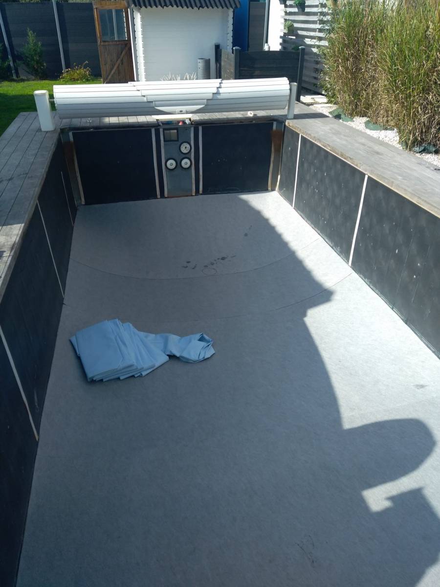 1/ nous déposons l'ancien liner, 2/ enlèvement du feutre, 3/ nettoyage complet du bassin et traitement antifongique, 4/ remplacement du feutre, 5/ Pose du liner ou de PVC armée, 6/ remplacement des joints et brides.