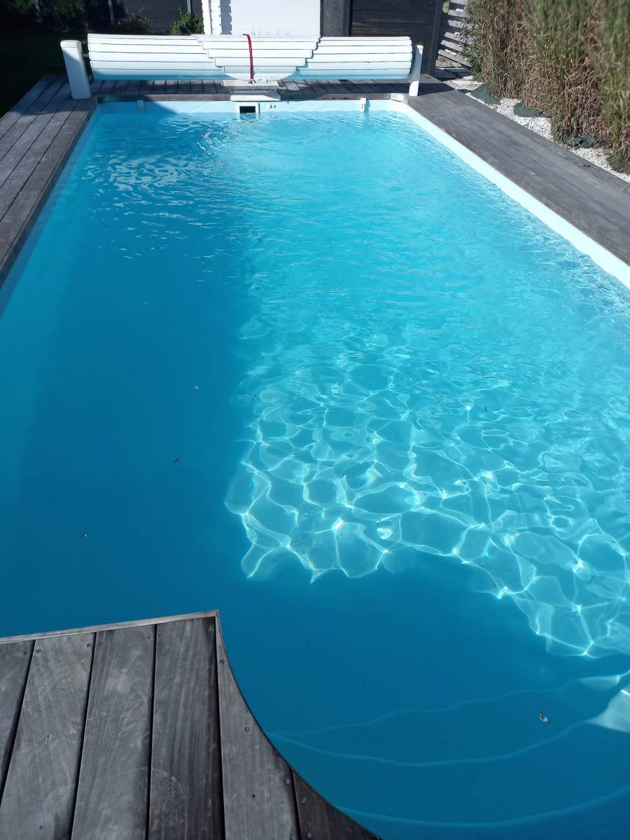 Ici nous avons remplacé sur la commune de PODENSAC, le liner de cette piscine qui était bleu clair par un blanc, ce qui apporte une touche de modernité au bassin .